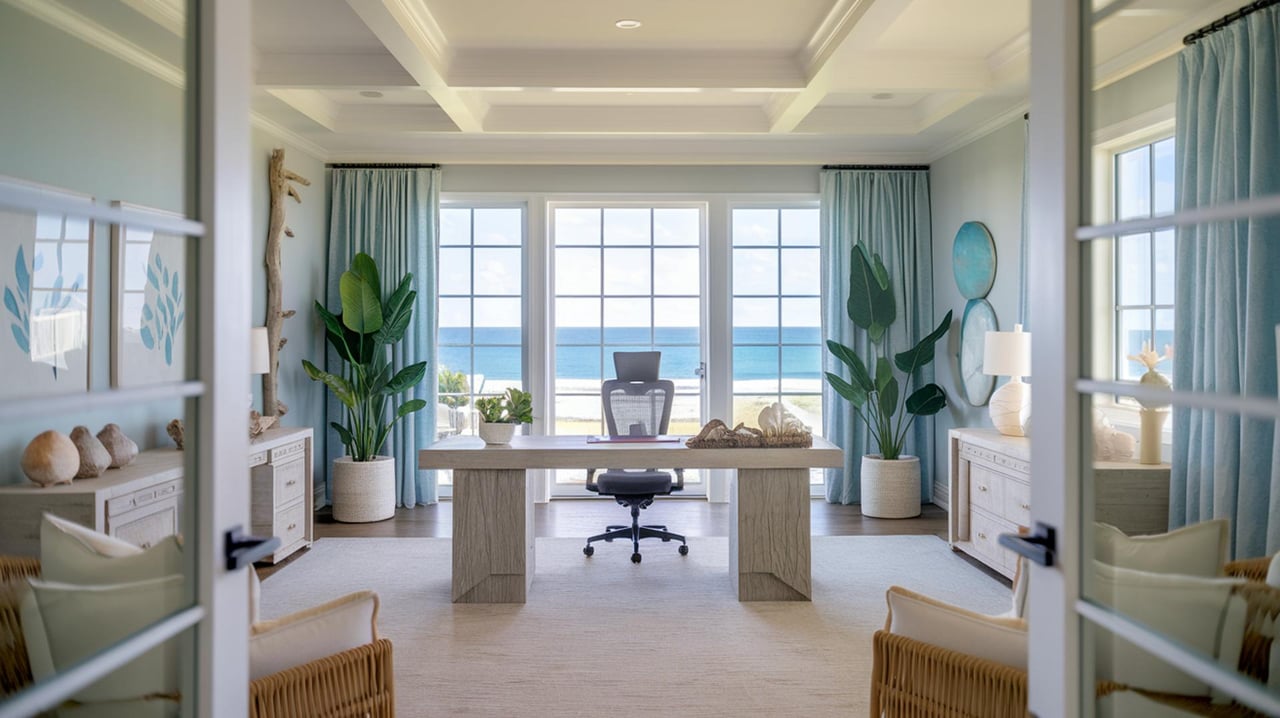 Indian Harbour Beach's coastal charm can be seamlessly integrated into your home office design. Use a color palette inspired by the sea, such as soft blues, sandy beiges, and crisp whites, to create a calming and cohesive look. Incorporate natural materials like driftwood, rattan, or wicker for furniture and accessories to enhance the beachy vibe. Adding artwork or decor featuring ocean scenes or local wildlife can also bring a touch of the outdoors into your workspace.